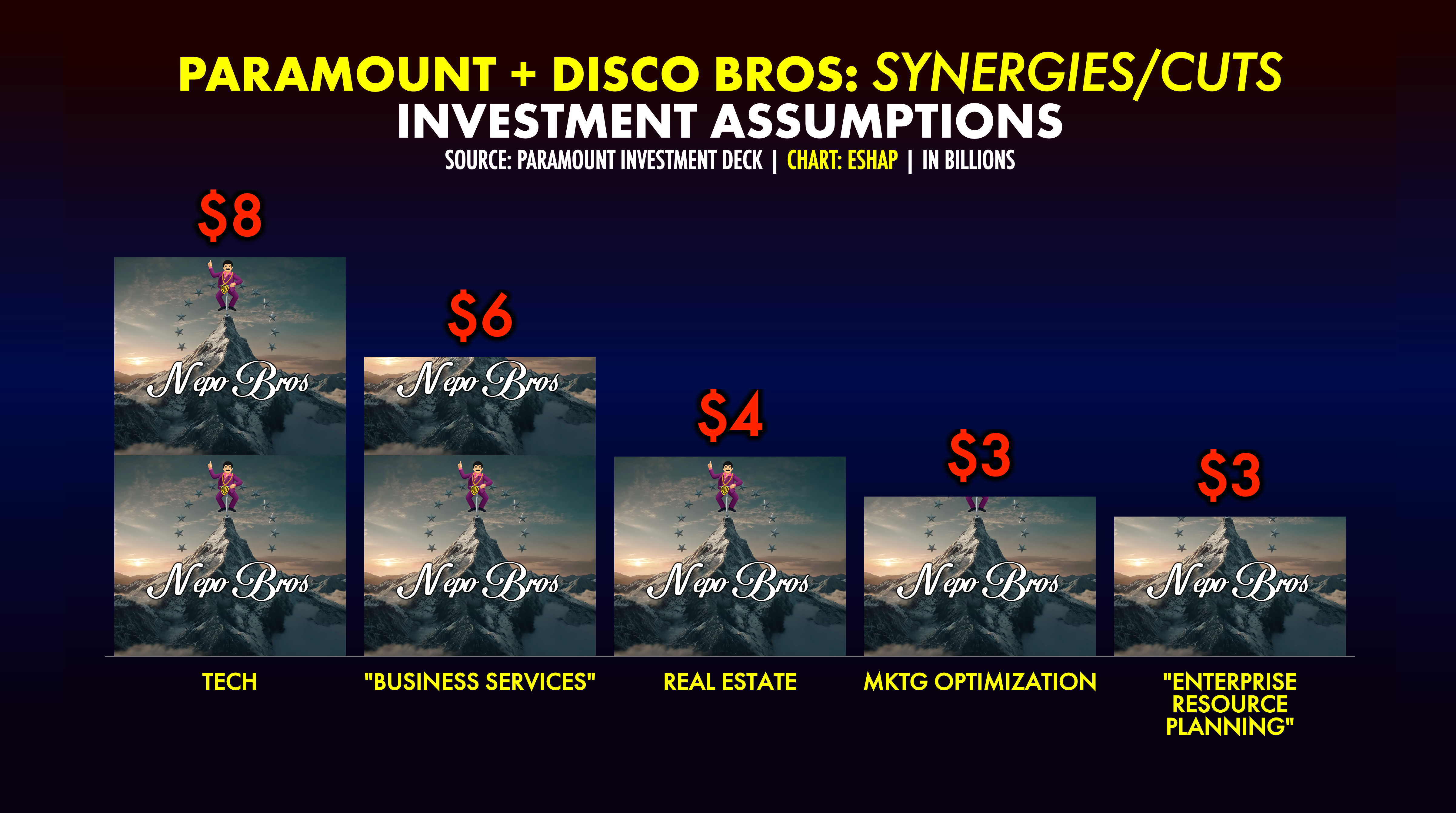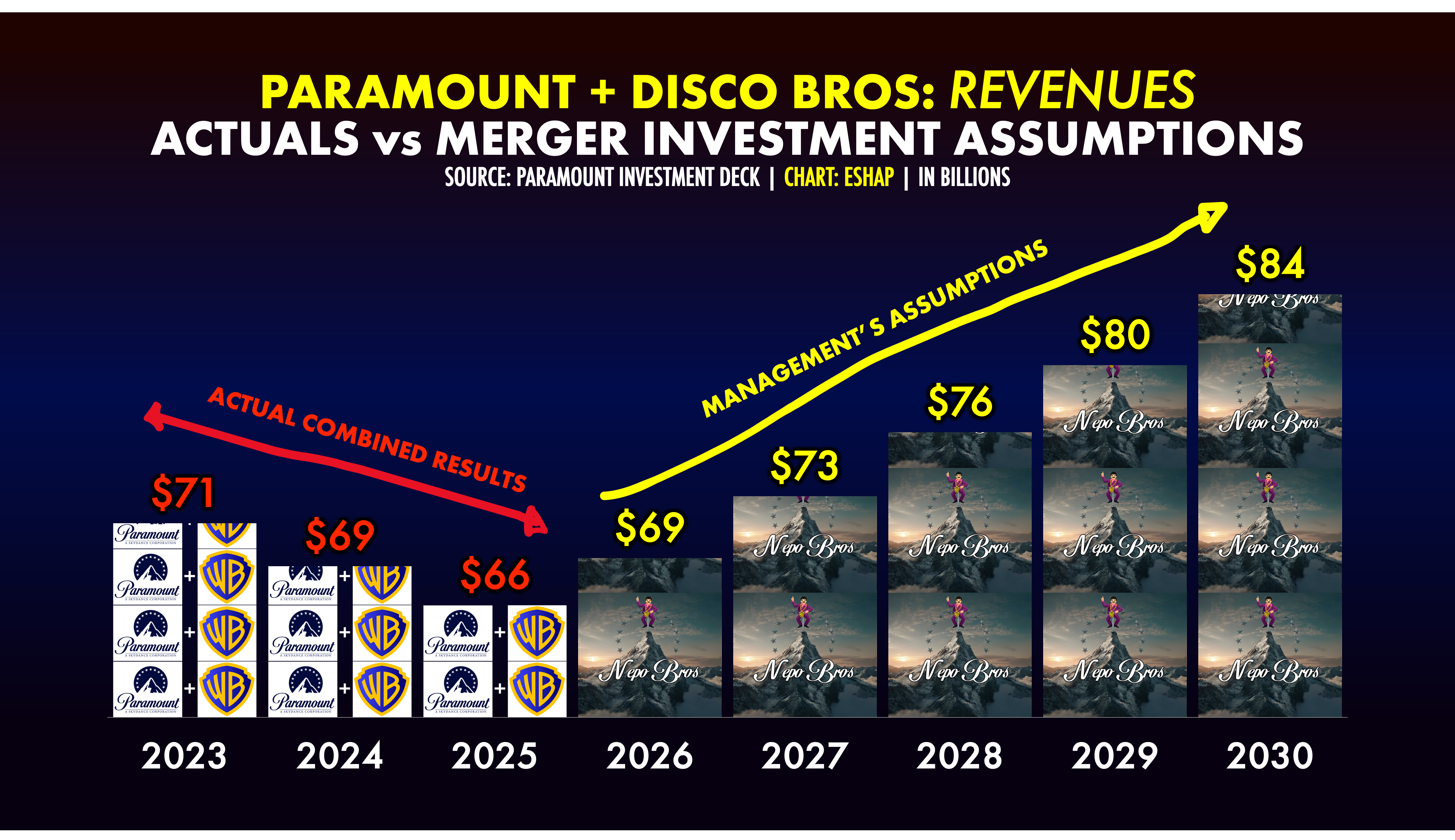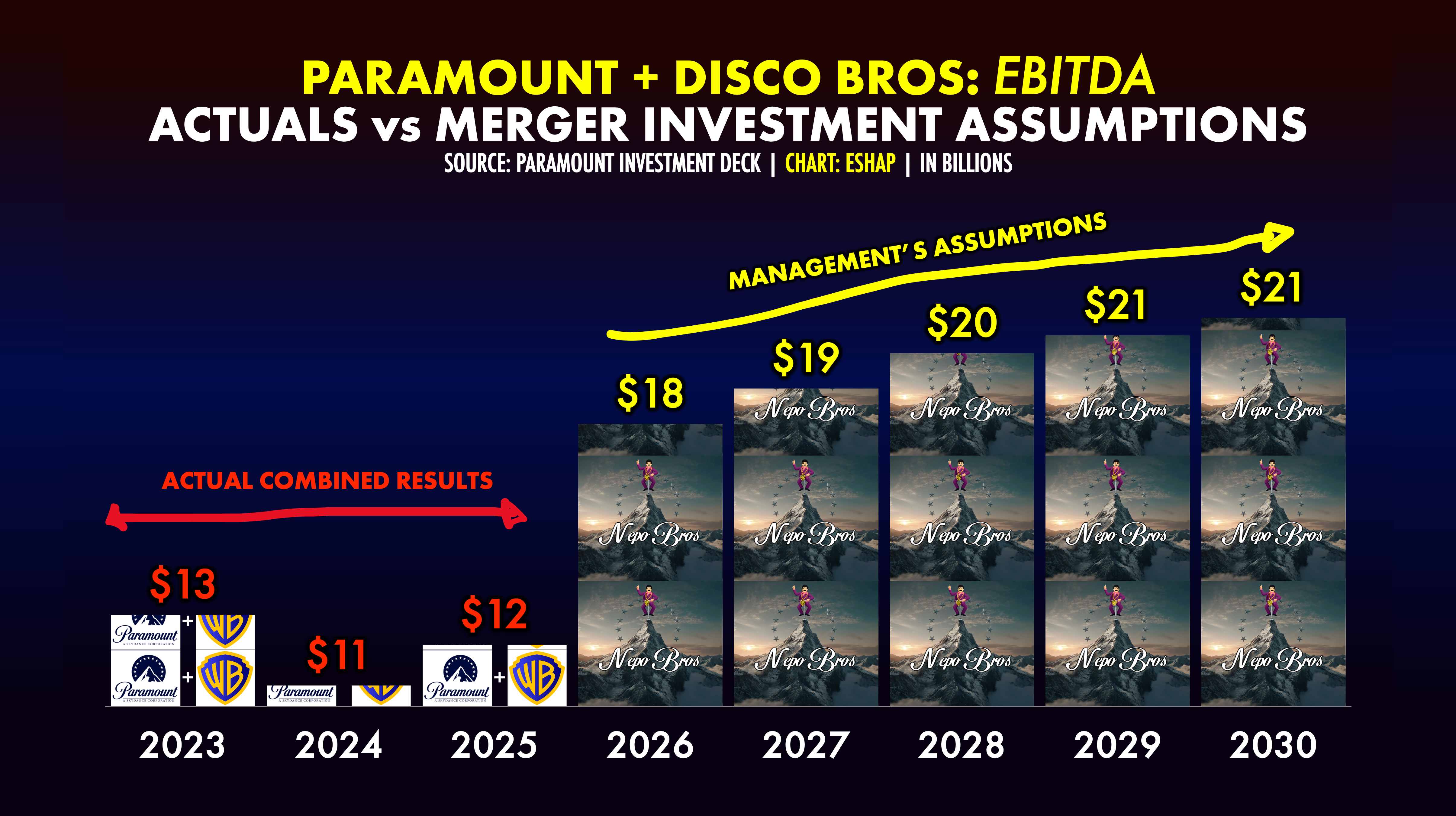 Here, you’ll see the EBITDA assumptions they’re selling their backers, juxtaposed with the current state of profits for Paramount and Disco Bros.