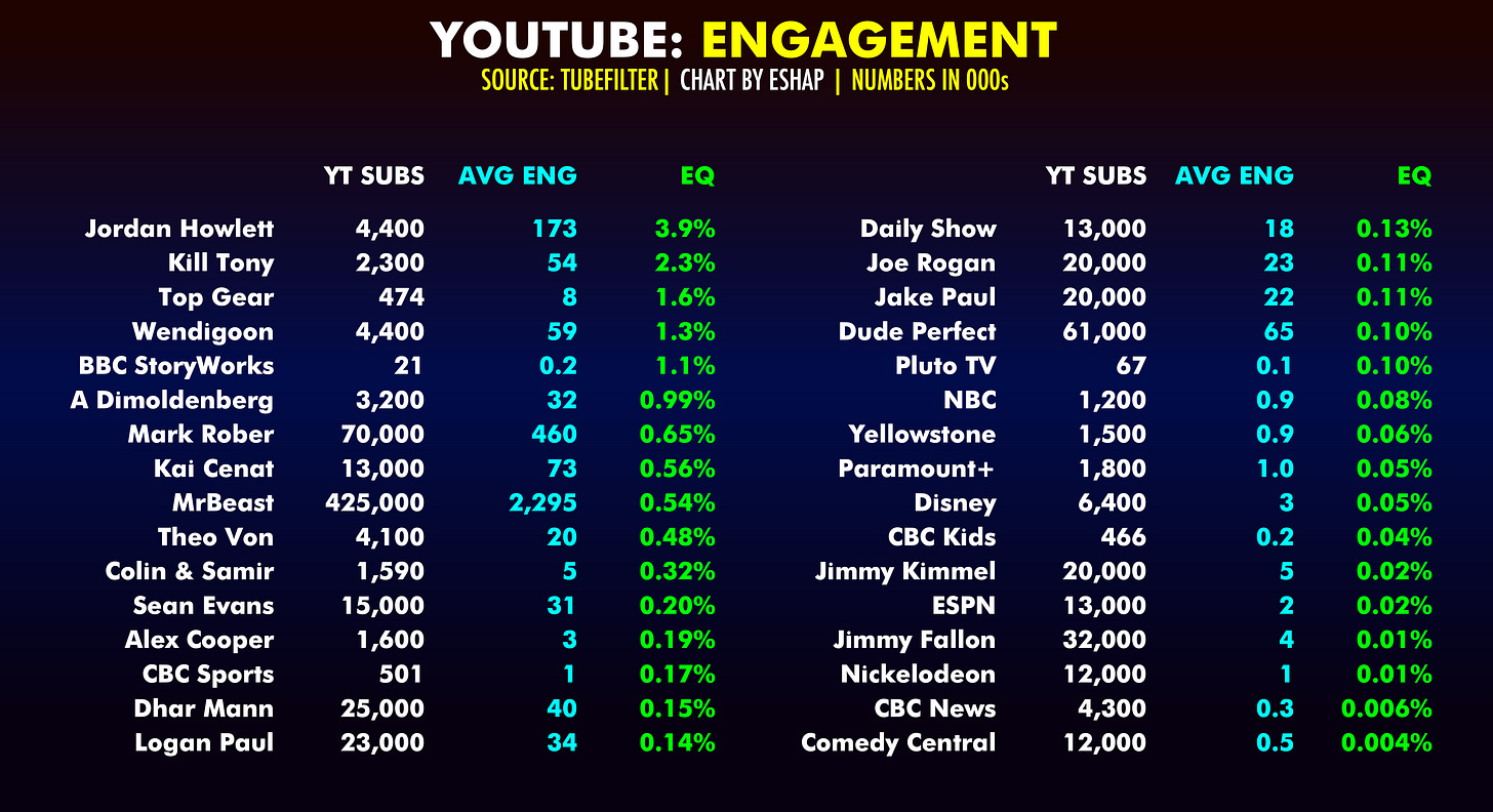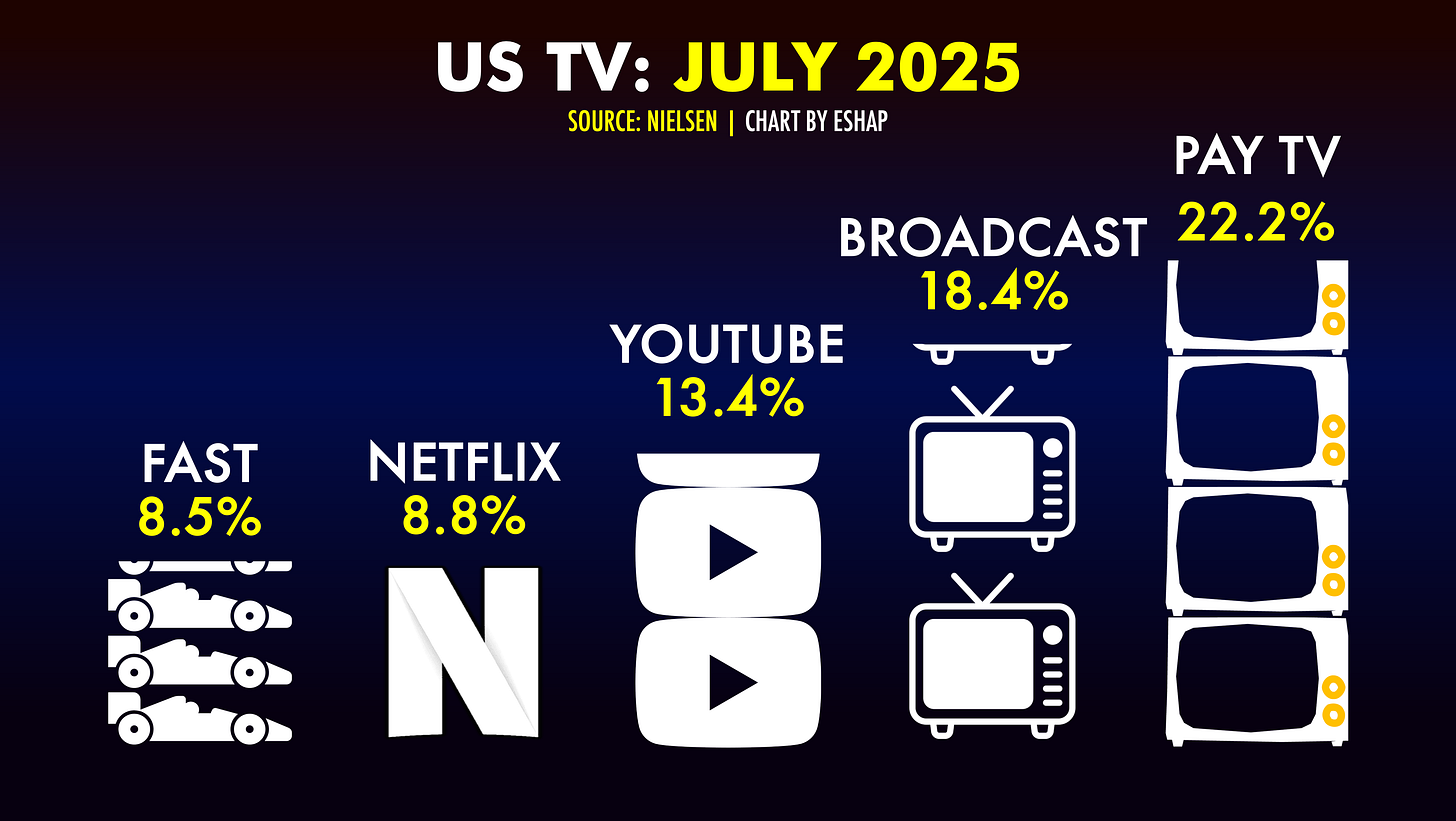 Nothing personifies this shift more perfectly than the current state of American Television, where YouTube is TV’s biggest channel, with a larger share of TV time than all of Disney (or NBCU, or WBD, or Paramount) combined - and is poised to overtake the entire US Broadcast ecosystem at some point next year (and all of pay TV shortly thereafter).