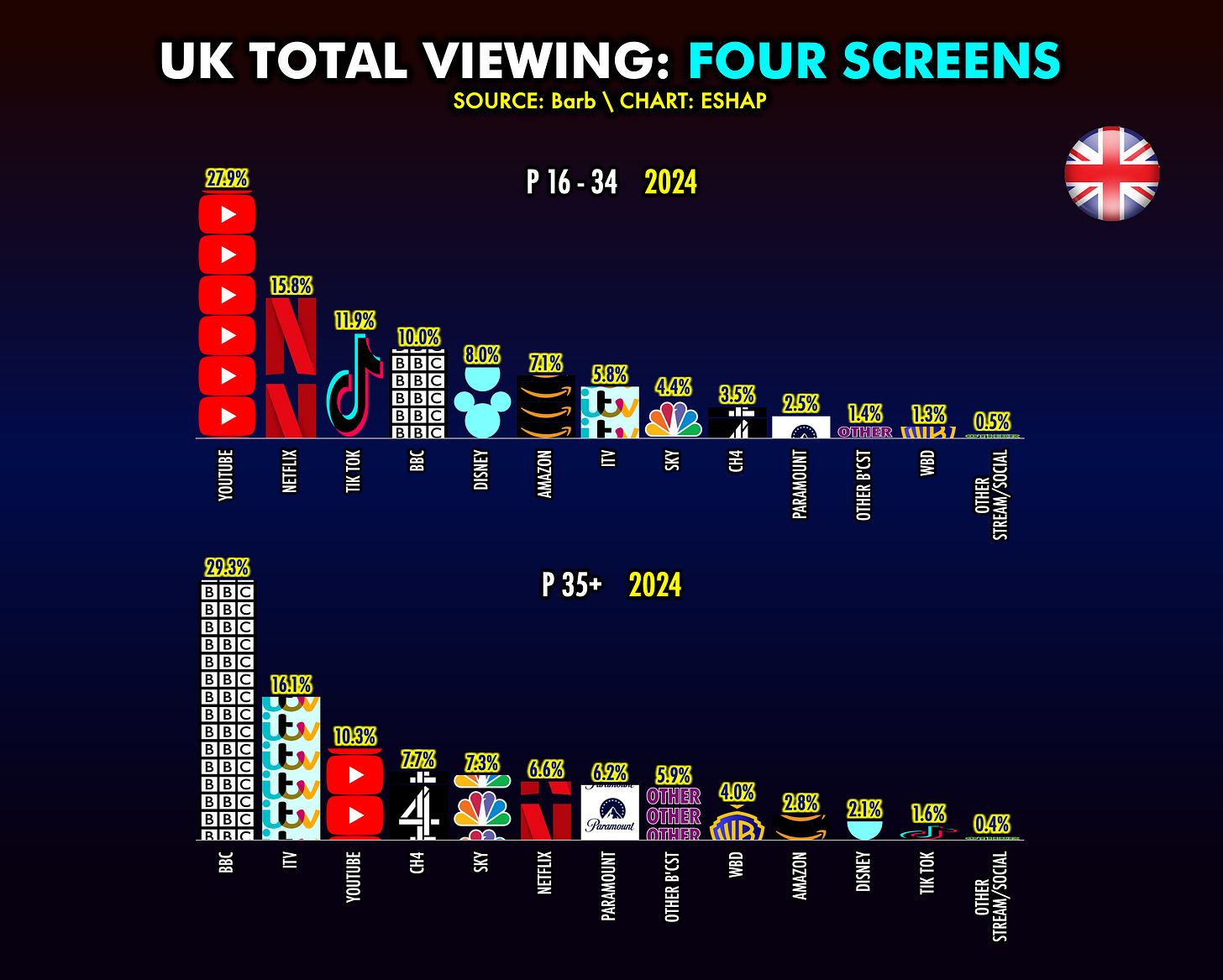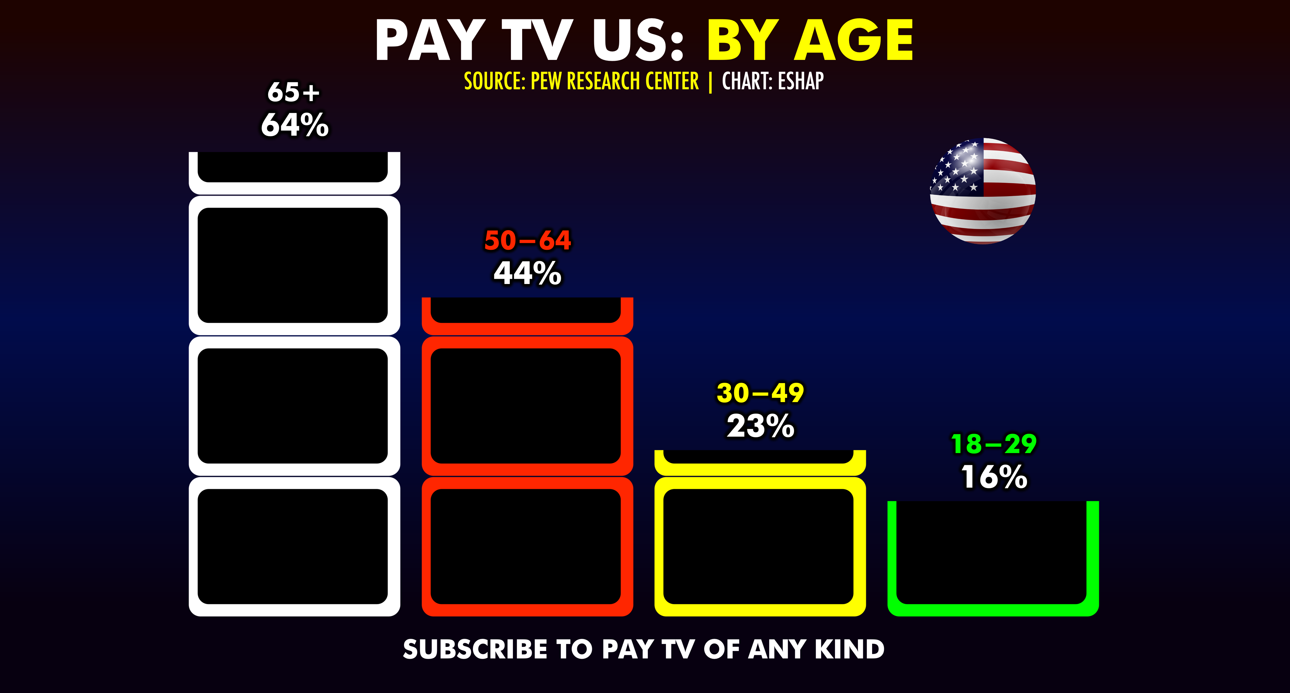 You can see the chasm on US Pay TV - with the biggest drop-off coming at the top edge of the Millennial age range. Despite deflections by the British Media elite, TV’s Generation Gap is also crystal clear across UK homes.