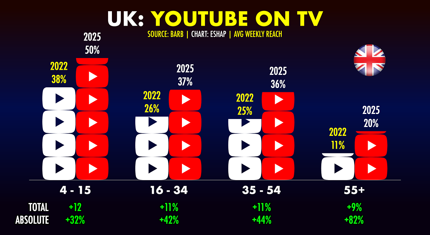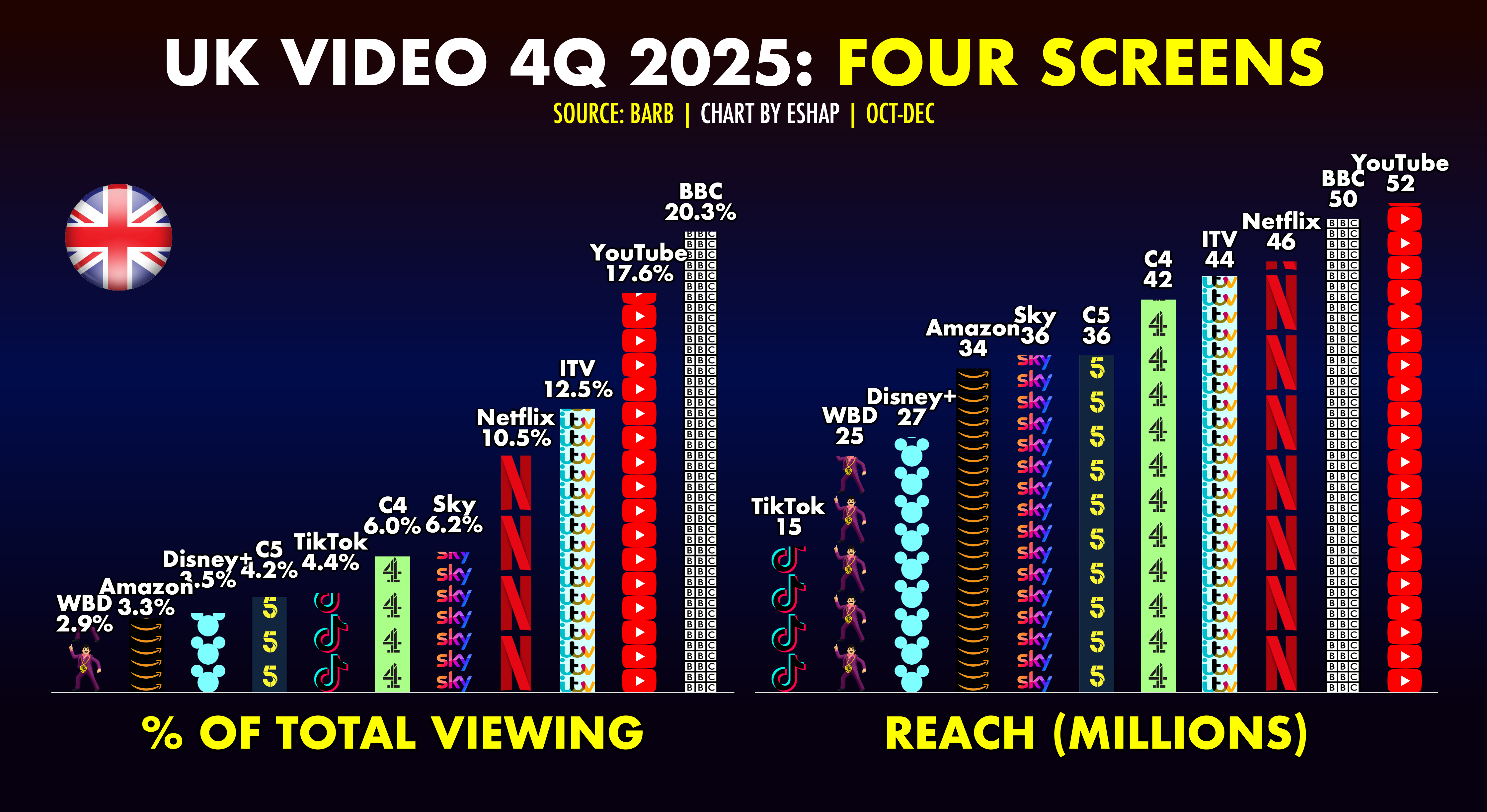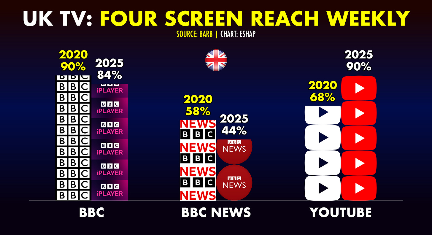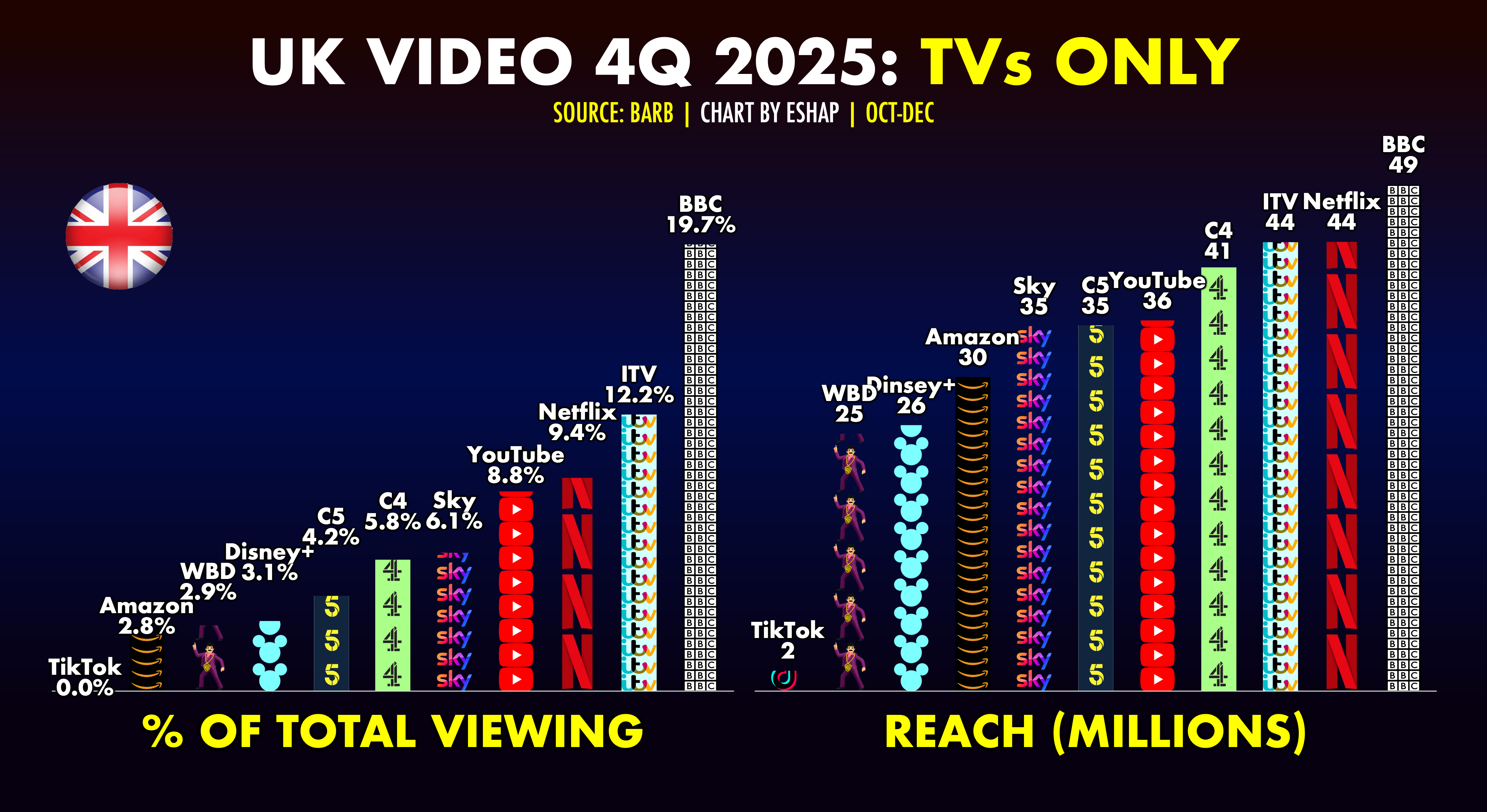 Less than a year later, Barb (the joint industry committee that measures TV in the UK) announced that YouTube had surpassed the BBC for total audience reach for all of 4Q 2025, the leaders of both BBC and Channel 4 have left, the BBC just announced a landmark deal with YouTube, ITV is for sale, and the shift away from “Traditional Telly” is accelerating.