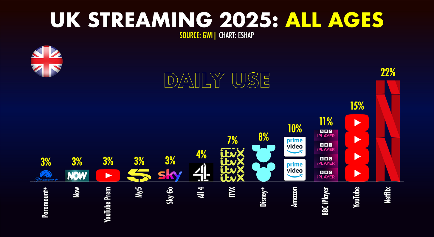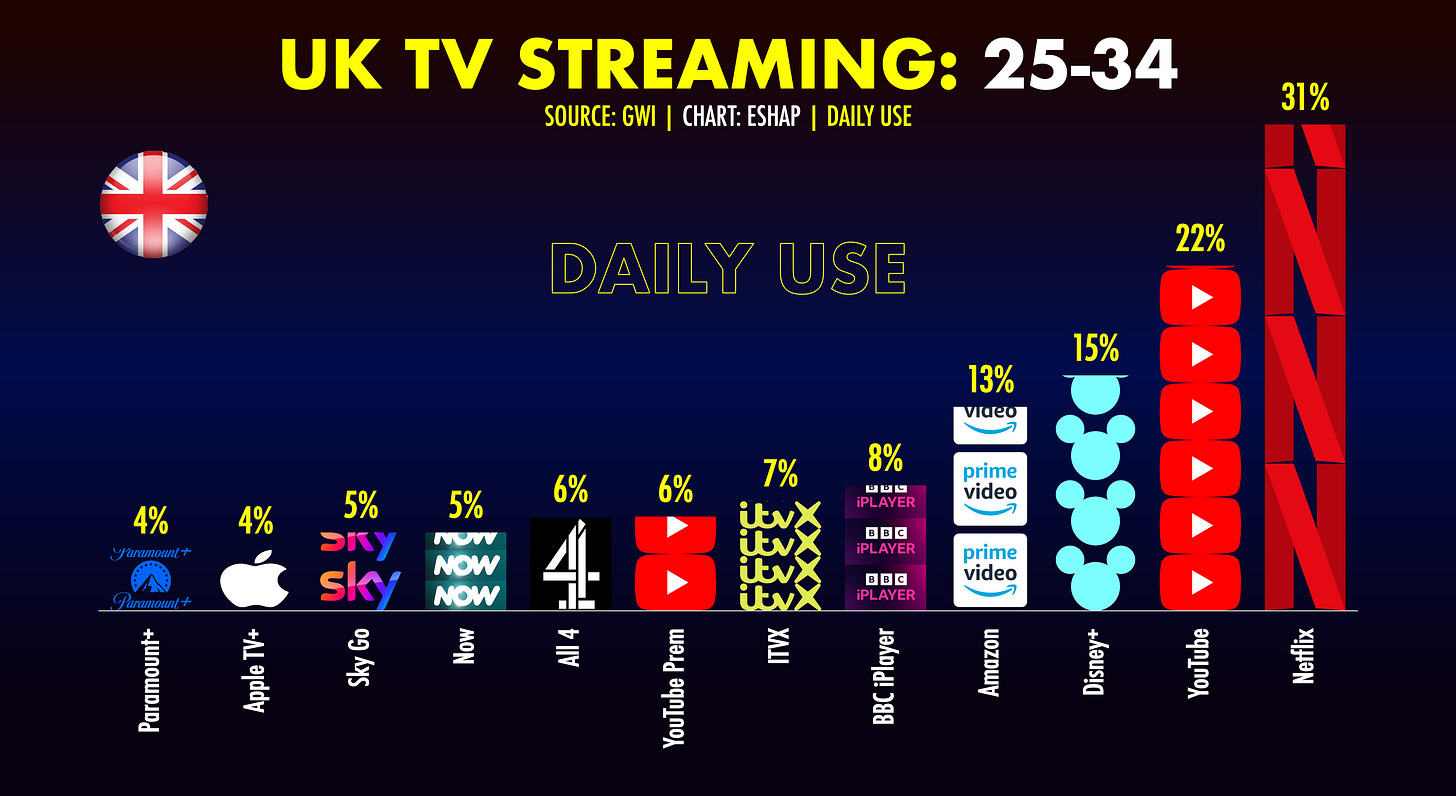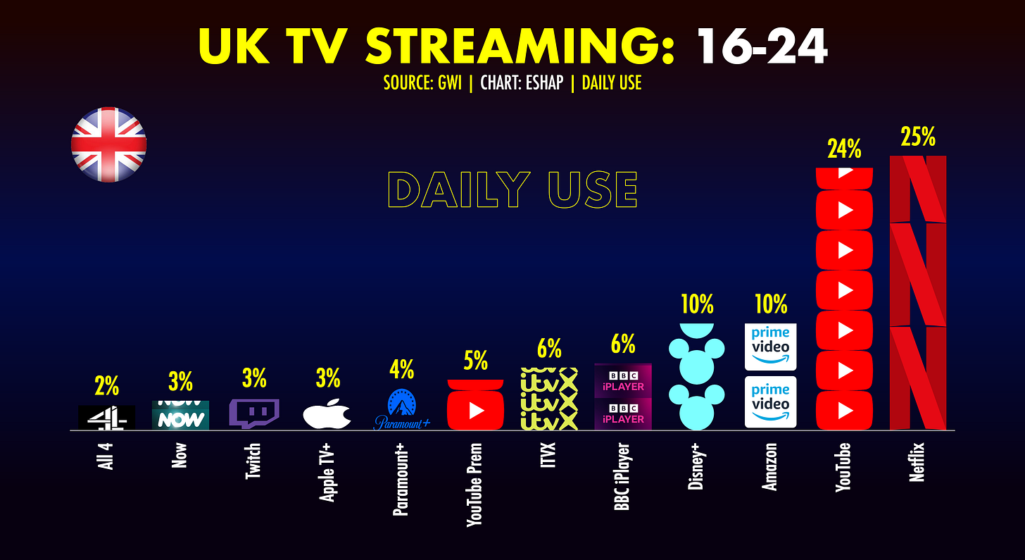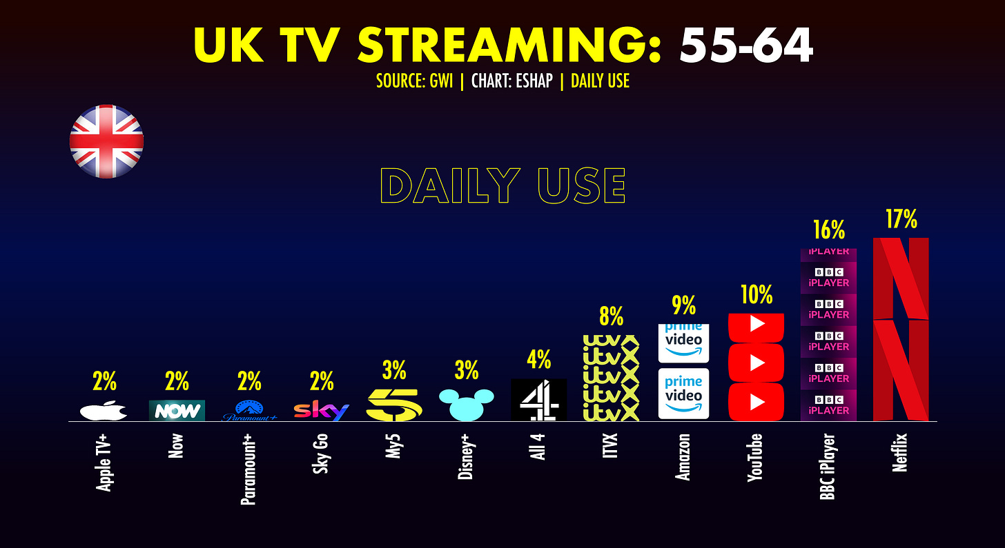 The OG UK Trad TV elite will tell me that this data is not what it appears to be; that this is streaming only and that UK broadcasters still have major institutional and behavioral advantages when you factor in broadcast and satellite.