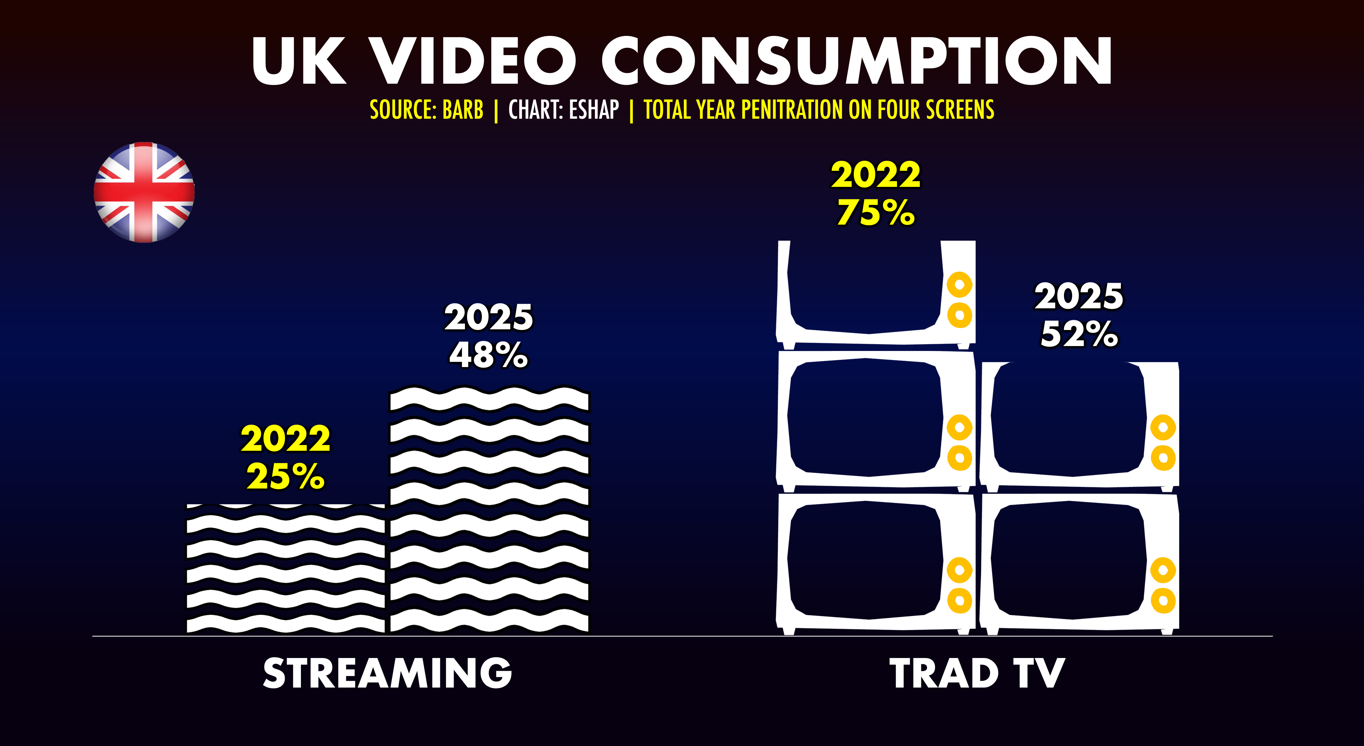 That is the primary driver for Traditional UK TV losing nearly one-third of its four screen audience over the last 36 months. Simultaneously, the combination of streaming and social video have nearly doubled over that same period - now garnering nearly half of all UK video consumption.