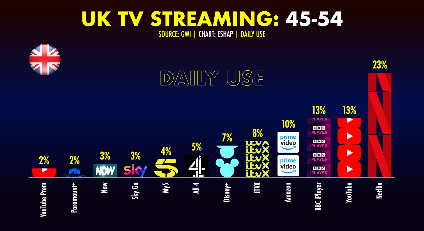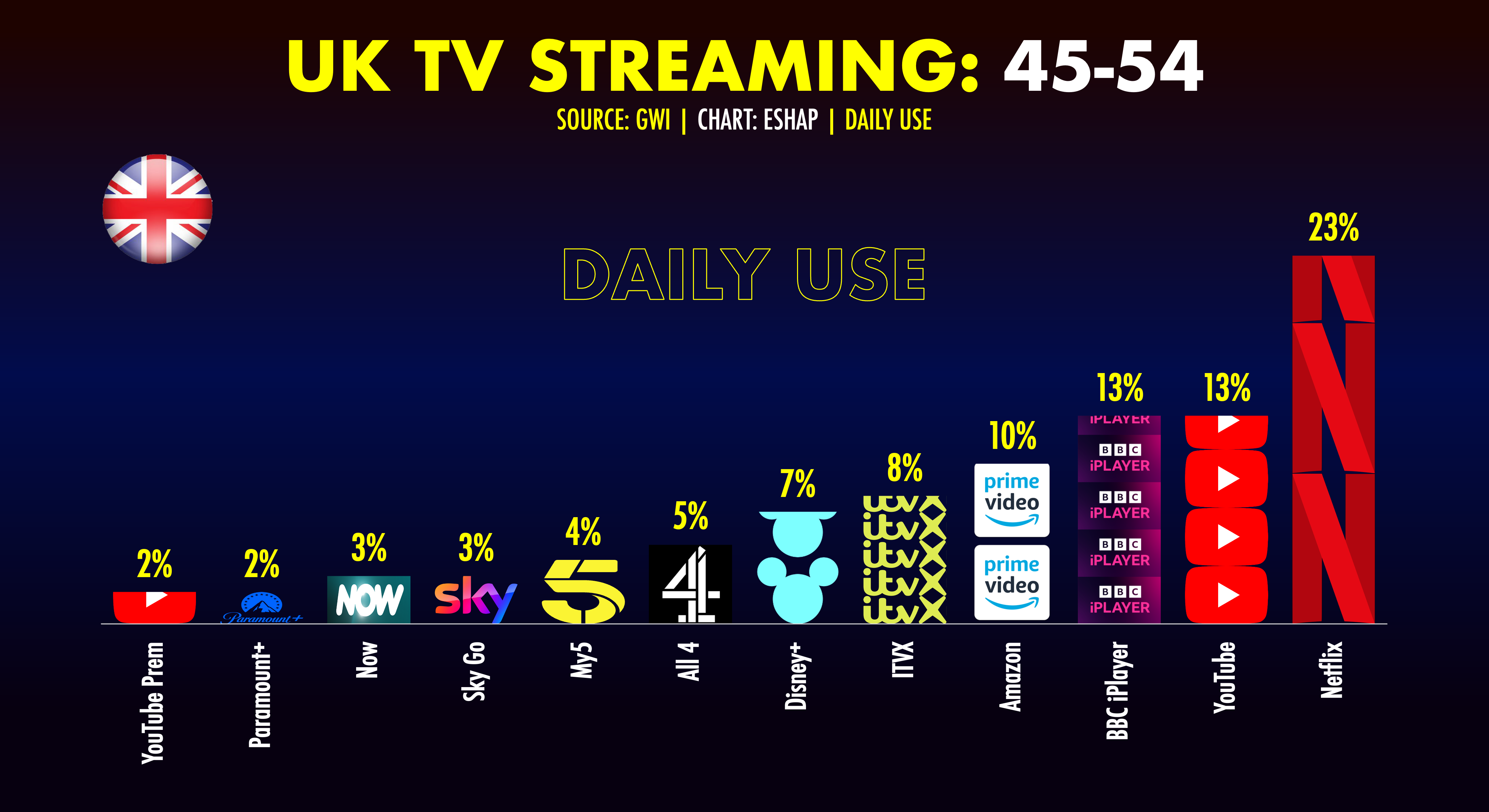 Gen X is a bit more streaming curious. Nearly one-quarter of Brits 45-54 stream Netflix daily - far more than BBC iPlayer.