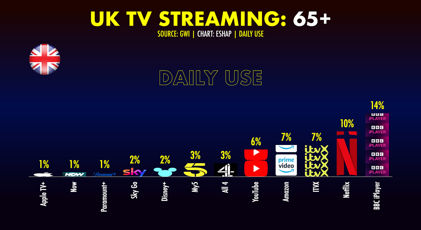 It should be noted that the UK was way out in front of the streaming migration - BBC launched their iPlayer in 2007, shortly after Netflix started streaming its content, ITV and Channel 4 quickly followed suit. This is another reason that UK Trad TV has been able to stave off the chaotic disintegration of its traditional TV ecosystem longer than major media in the US (most of whom waited until 2019 or 2020 to jump into streaming with any vigor). 52% of all video consumption and 11% of all streaming TV in the UK still goes to British broadcasters.