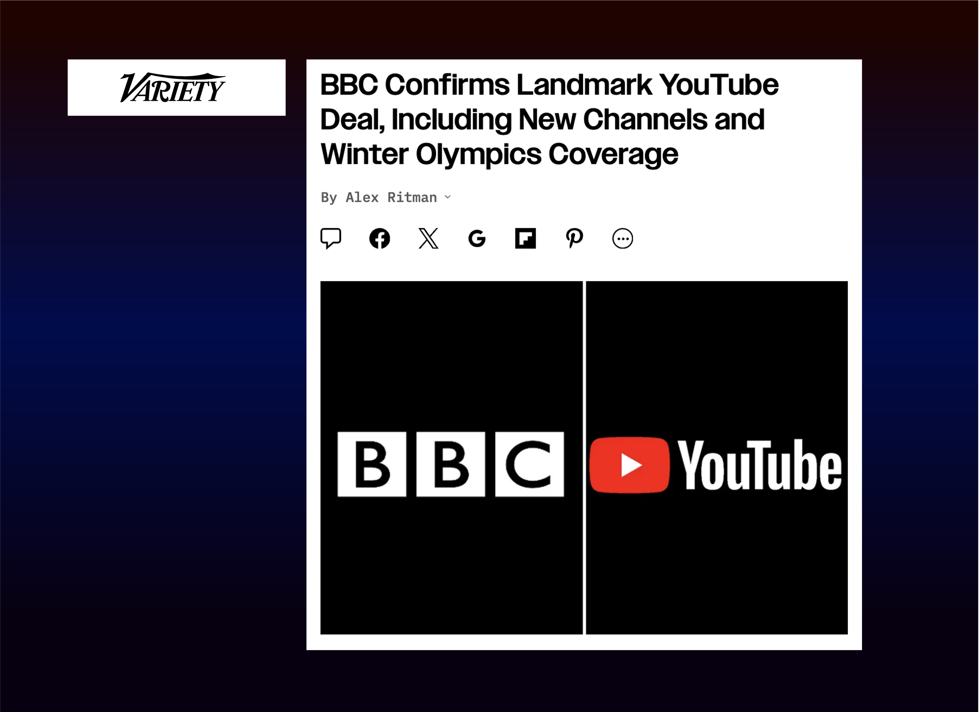 This year, after a disastrous fall, the Beeb announced a “landmark deal” with YouTube. The BBC will invest millions of pounds into “digital-first shows, documentaries, news, and sports content to be available on YouTube and BBC platforms.”