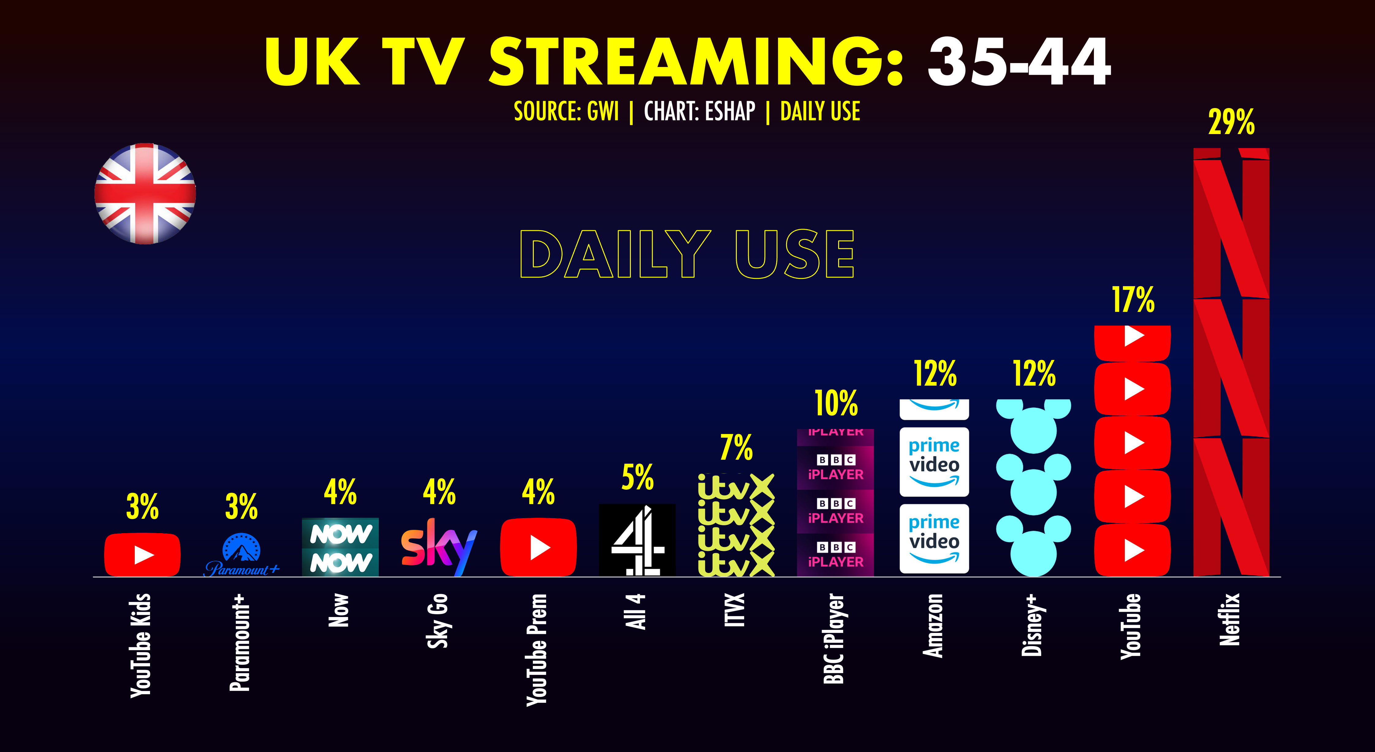 Not one native UK streaming service appears in the top four streamers for daily use of all Brits under 45. Not one. Meanwhile, more than half of all Brits 16-44 stream either Netflix or YouTube, everyday, yet less than 10% use each of the native British streaming services daily.